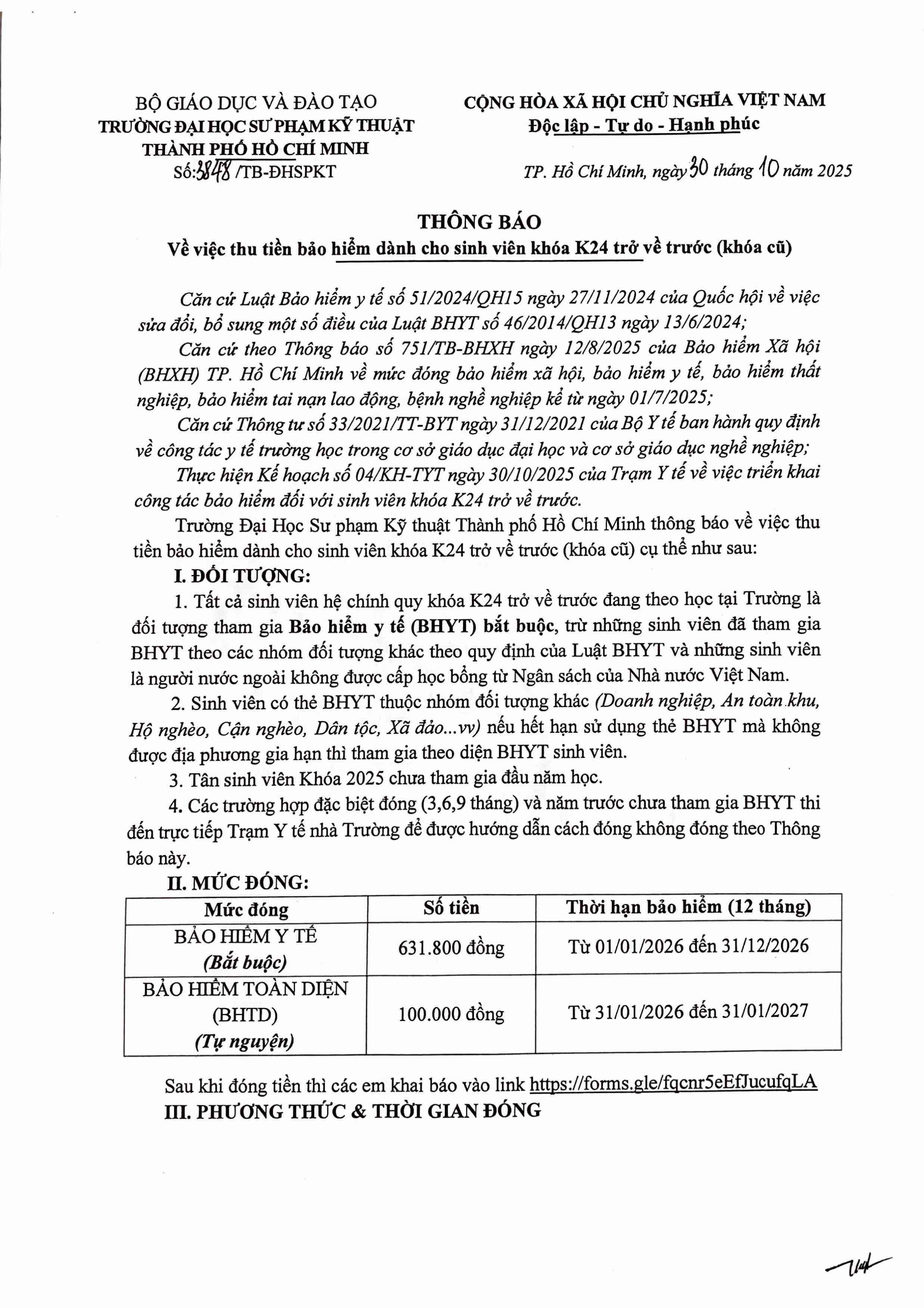 Thông báo về việc thu tiền bảo hiểm dành cho sinh viên khóa K24 trở về trước (khóa cũ)